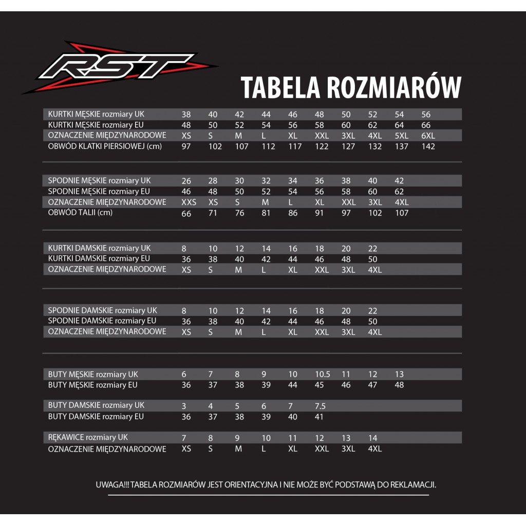 RST jest najbardziej znane ze swoich skórzanych produktów, przeznaczonych do sportowej jazdy (kombinezony, rękawice, kurtki i spodnie), jednak od pewnego czasu skutecznie rozwija także dział odzieży szosowej i turystycznej.