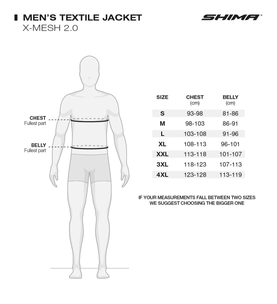 Kurtka motocyklowa tekstylna Shima X-Mesh 2.0 to miejski model o dopasowanym kroju, idealny na letnie i pogodne dni. Obszerne meshowe panele na klatce piersiowej, plecach i rękawach zapewniają doskonałą cyrkulację powietrza. Wykonana z trwałego poliestru 500D powlekanego poliuretanem, posiada podwójne szwy i regulację miękkimi rzepami w pasie i mankietach. Wyposażona w dwie przednie kieszenie i certyfikowane ochraniacze AirForce™ na łokciach, ramionach i plecach, które są elastyczne i przewiewne.